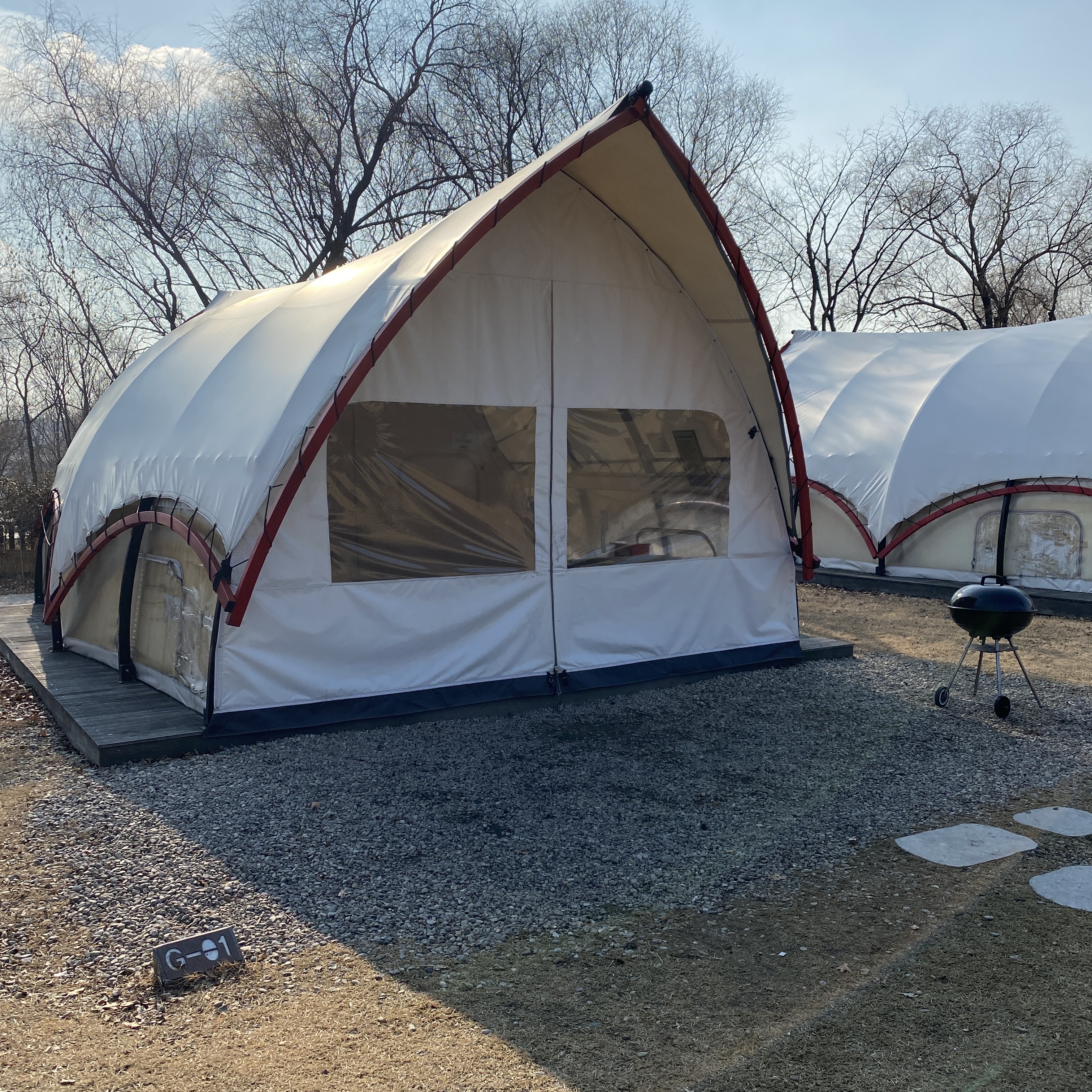 난지캠핑장엔 총 5개의 글램핑 사이트가 있는데 그중에서도 화장실과 가장 가까운 1번 자리를 골랐다.