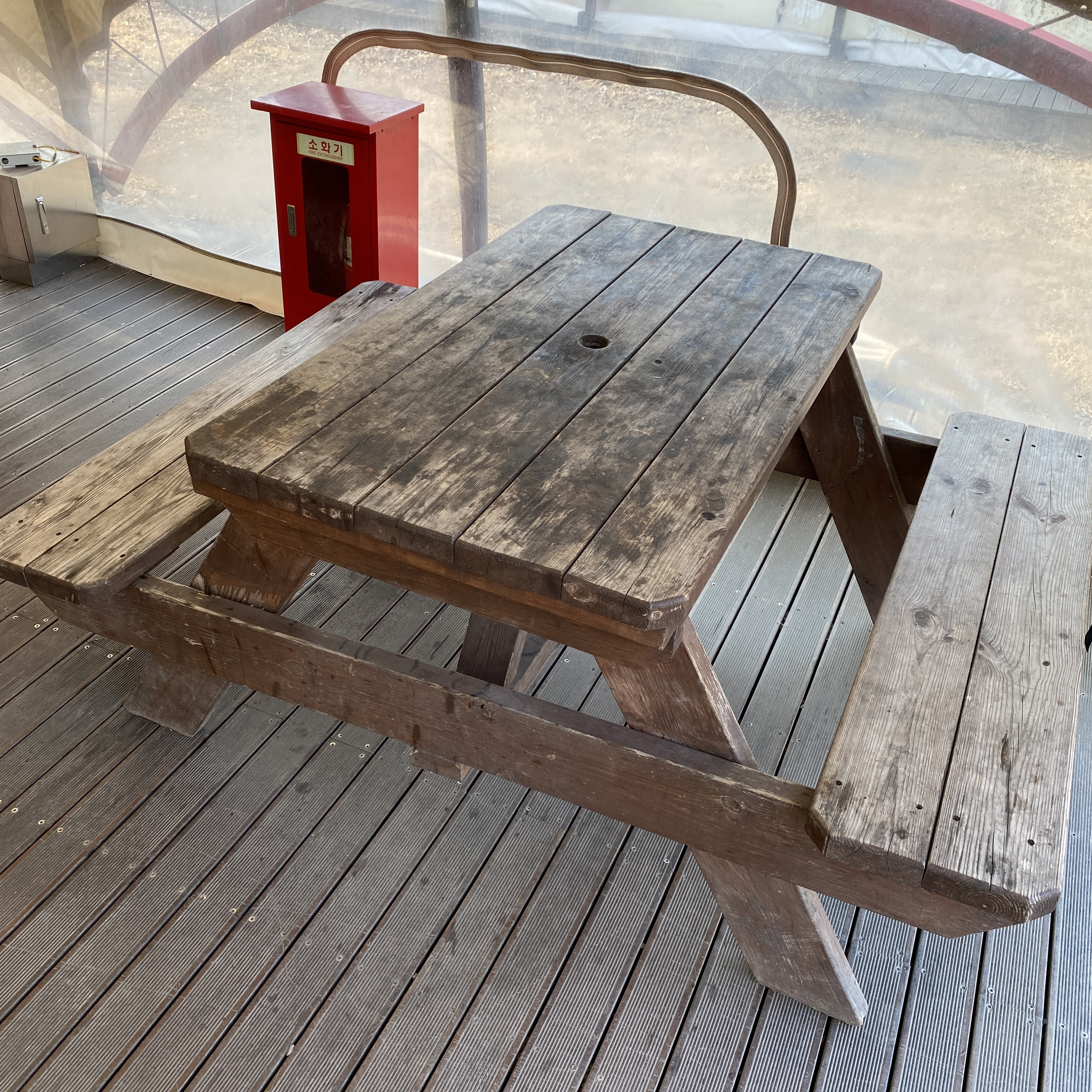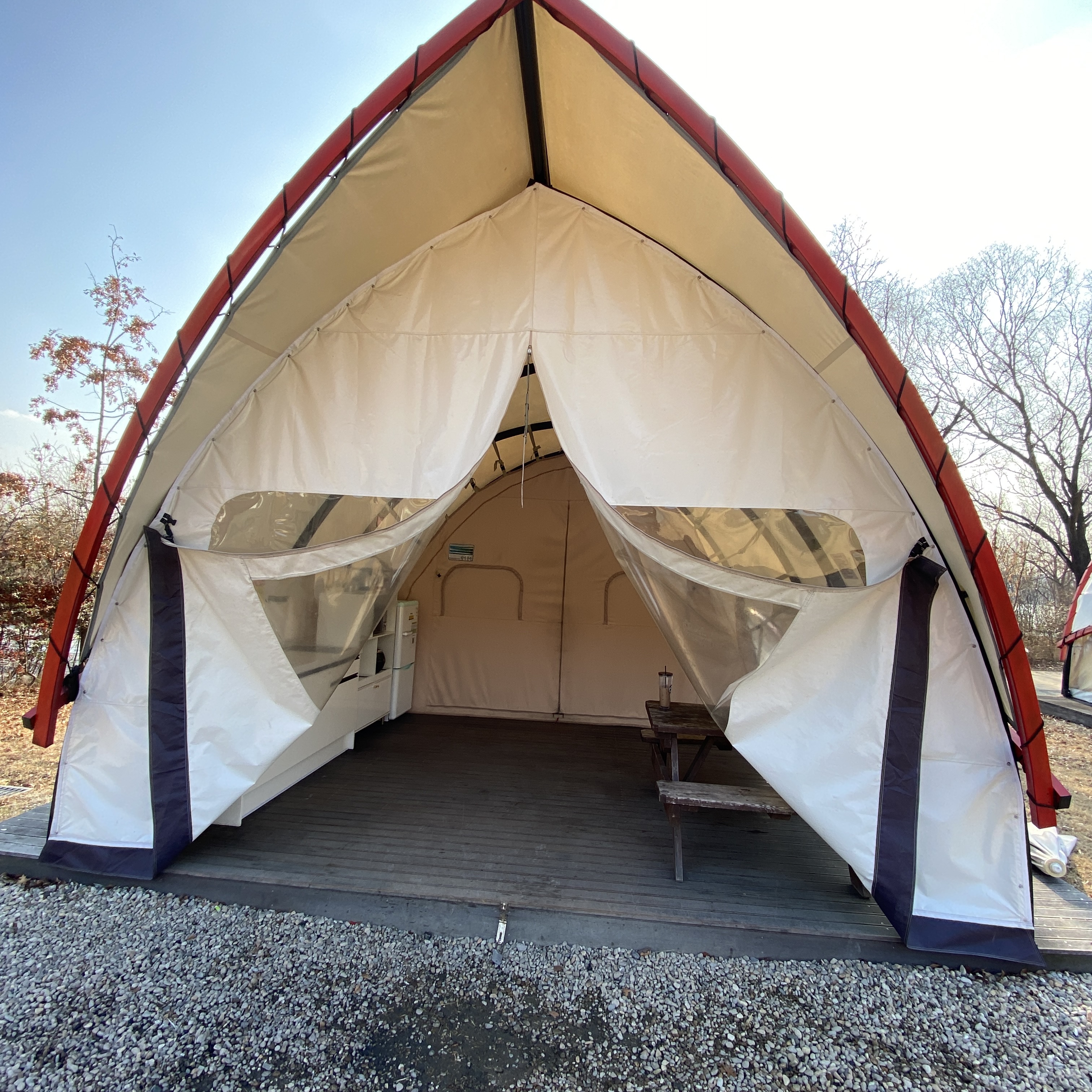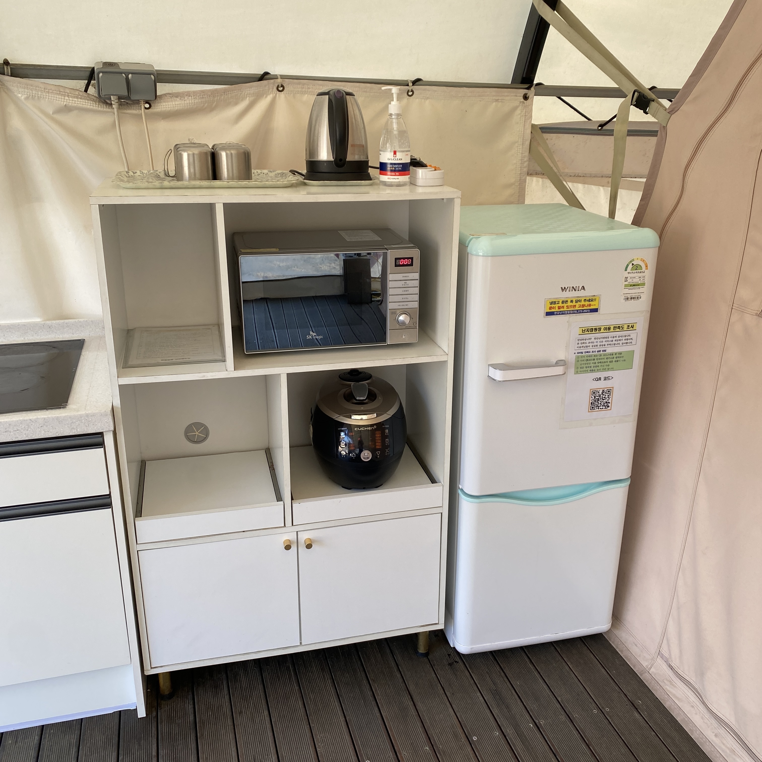 텐트 안 전실에 해당하는 공간에는 4인용 테이블과 냉장고, 밥솥, 전자레인지, 기본적인 식기류, 커피포트가 비치되어 있다.