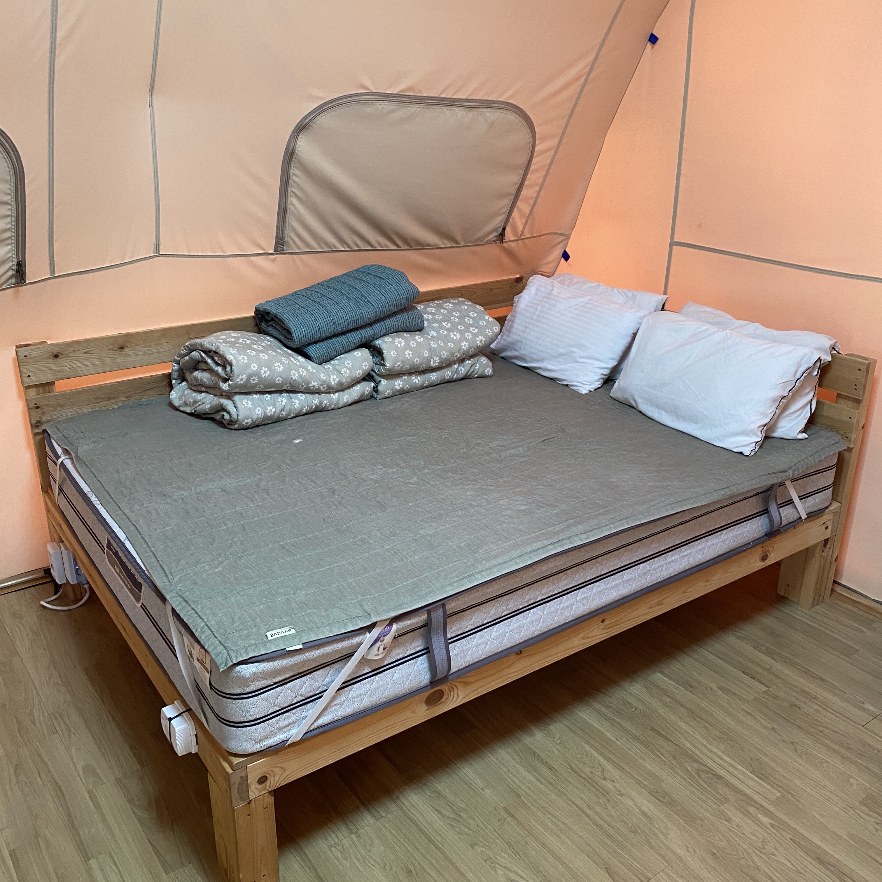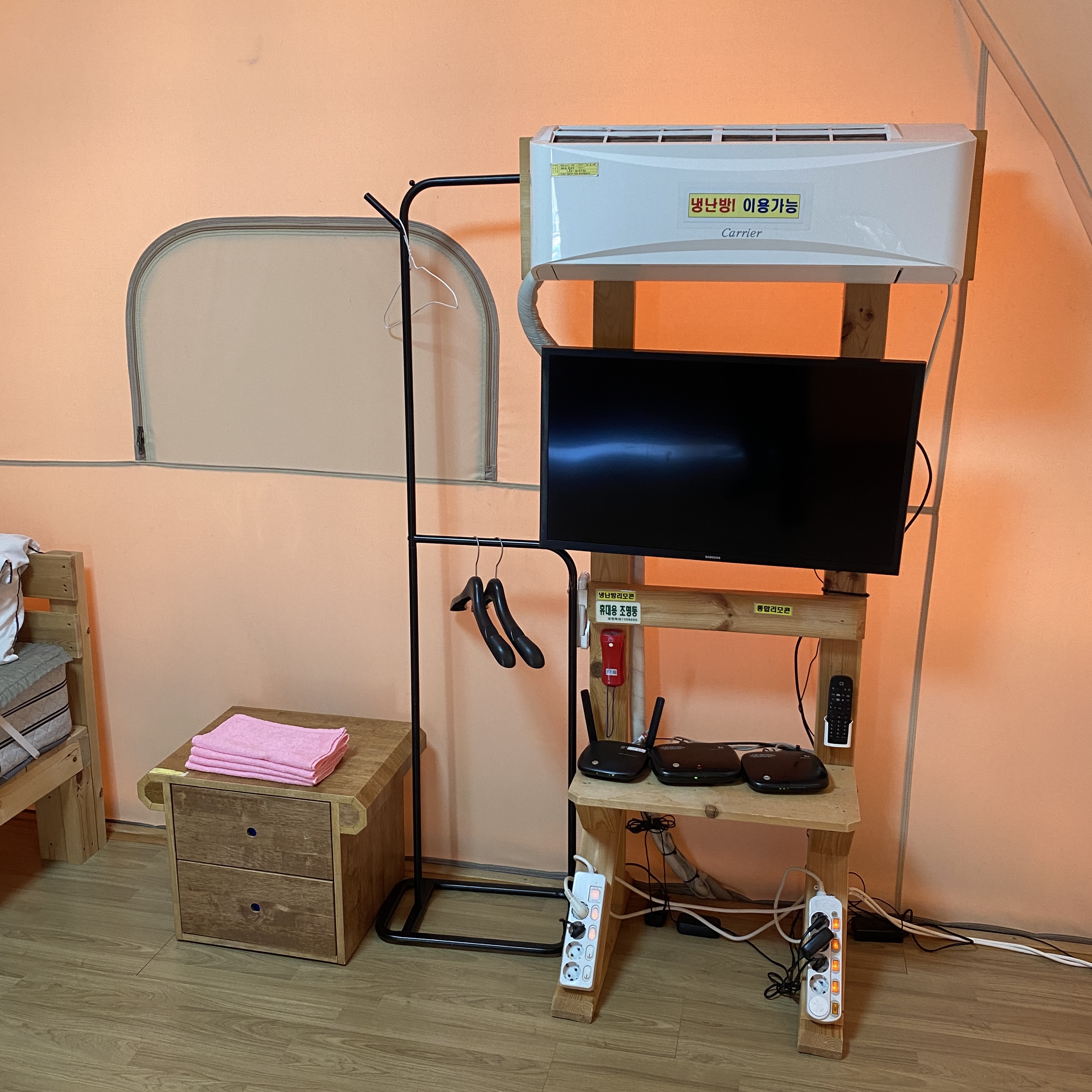 텐트 안엔 기본적인 침구류와 TV, 공유기, 멀티탭, 옷걸이 등이 비치되어 있었다.