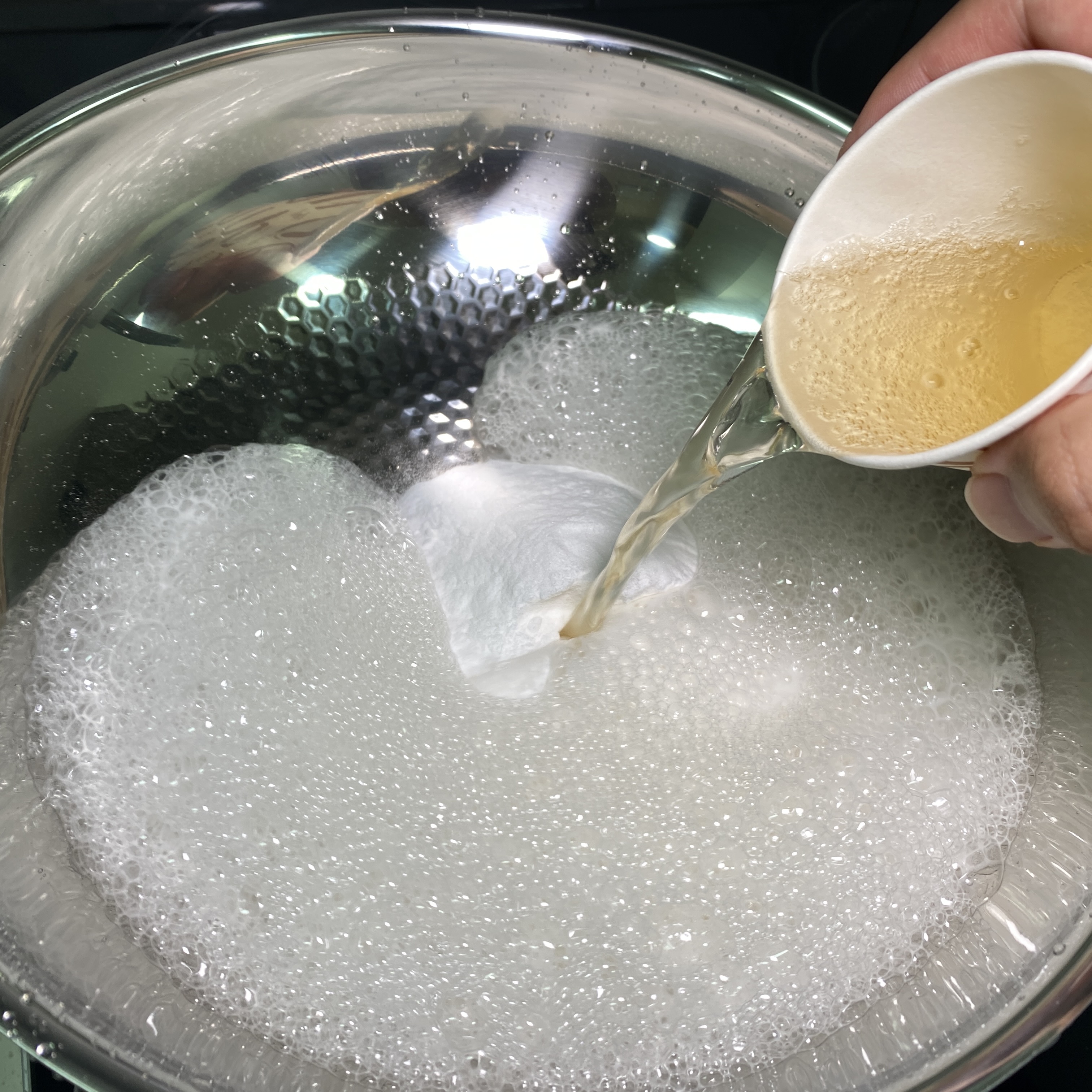 그리고 베이킹소다와 같은 양의 식초를 스텐팬에 부어준다.