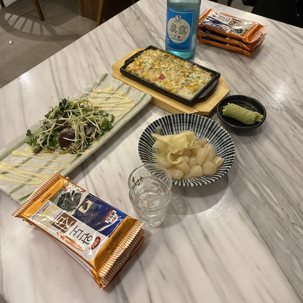 참치 튀김(?)과 참치 머리 조림, 참치 타다끼 샐러드, 락교와 생강, 생와사비, 콘치즈, 김이 세팅됐다.