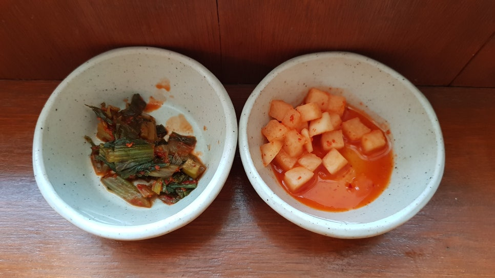 왼쪽은 갓김치고 오른쪽은 깍두긴데 깍두기는 달콤한 맛이 강하고, 갓김치는 맛있다.