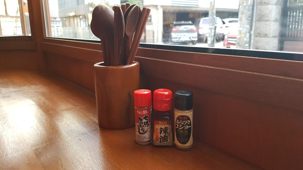 테이블 한 쪽 구석에는 수저와 각종 조미료가 배치되어 있다.